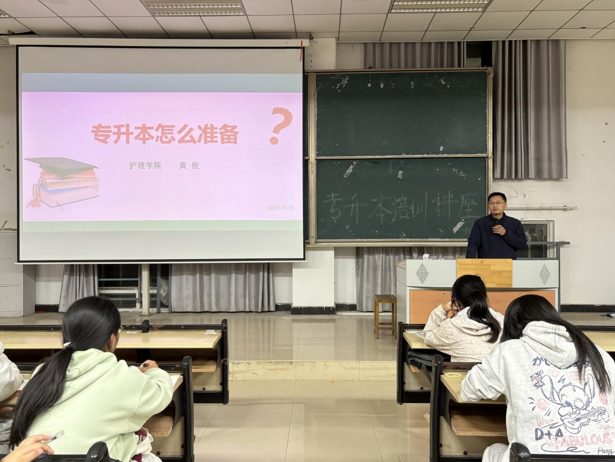 通讯员(本网讯:邹倩倩 曾楚川 付佳仪)为帮助护理、助产专业大一新生明晰学历提升路径,全面掌握专升本政策与备考要点,科学规划未来学业与职业发展,10月13日晚自习,护理学院在教学楼201教室举办专升本专题讲座,本次讲座由黄俊老师主讲。