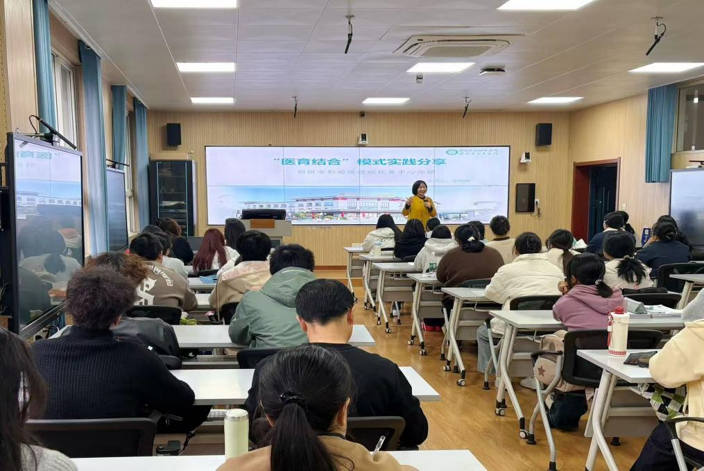 在随后的专题讲座中,李园长围绕《“医育结合”模式实践分享》这一主题,从国家政策、服务模式到中心建设与管理,全面介绍了荆州市妇幼保健院托育综合服务中心的实践经验,系统阐述了托育园“公建公营、医育结合、科学养育、寓教于乐”的办园理念。进而,李园长结合一线实际经验,重点向同学们强调了托育工作者必须具备的“三心”——责任心、耐心与爱心,并指出“三心”是婴幼儿托育工作的基石,更是“医育结合”模式有效推行的重要保障。