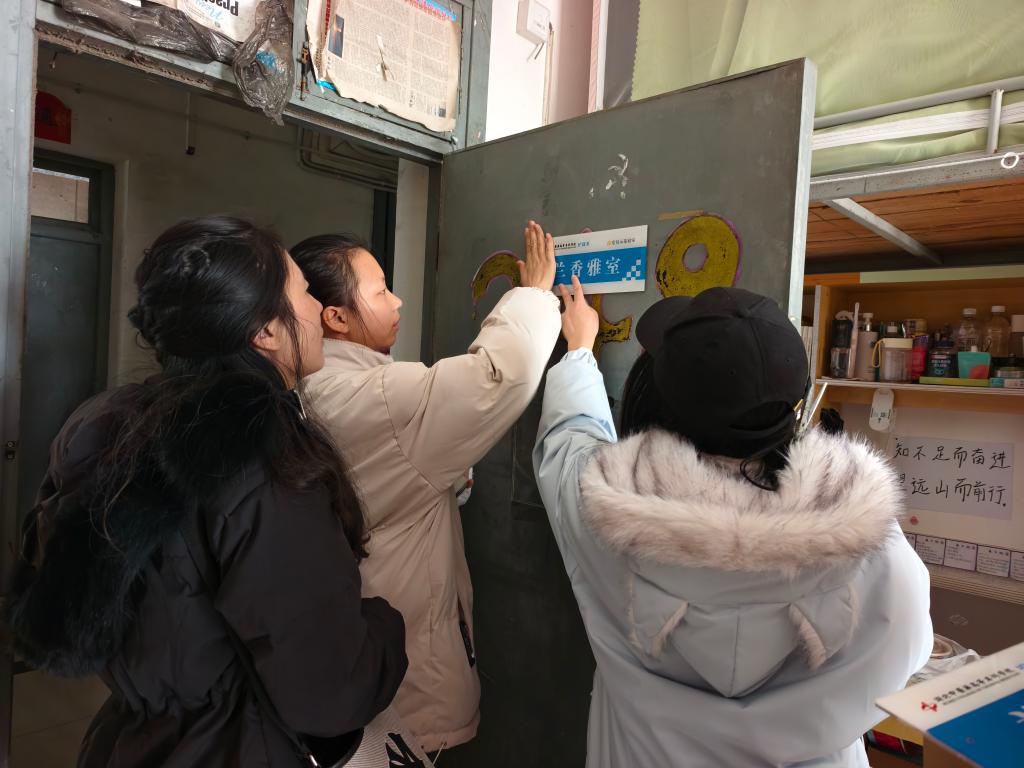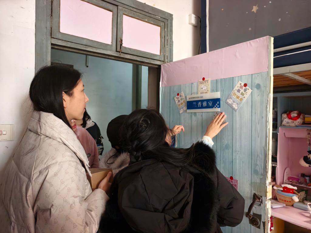 此次走访,辅导员们逐间走进学生寝室,细致察看卫生环境、物品摆放及安全用电情况。在兰香雅室示范寝室,宿舍门上或贴着优美的诗词或挂着精美的对联,宿舍内地面洁净、床铺整齐、学习区域有序,门口展现了良好的日常自我管理能力。走进党员示范寝室,墙上张贴的党建材料、整齐摆放的学习书籍、营造了积极向上的文化氛围,更彰显出学生党员在思想引领和寝室建设中的先锋模范作用。辅导员对示范寝室的优秀表现给予赞许,并鼓励同学们继续发扬先进作风,坚持维持宿舍整洁,带动更多寝室共同进步。