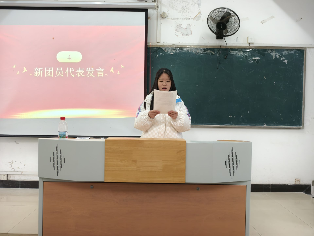 学生党支部书记杨青向新团员表示祝贺。她强调了共青团作为党的助手和后备军的光荣使命,并寄语大家坚定信念、精进学业、锤炼品格,以入团为人生新起点,在实现民族复兴的赛道上奋力奔跑。
