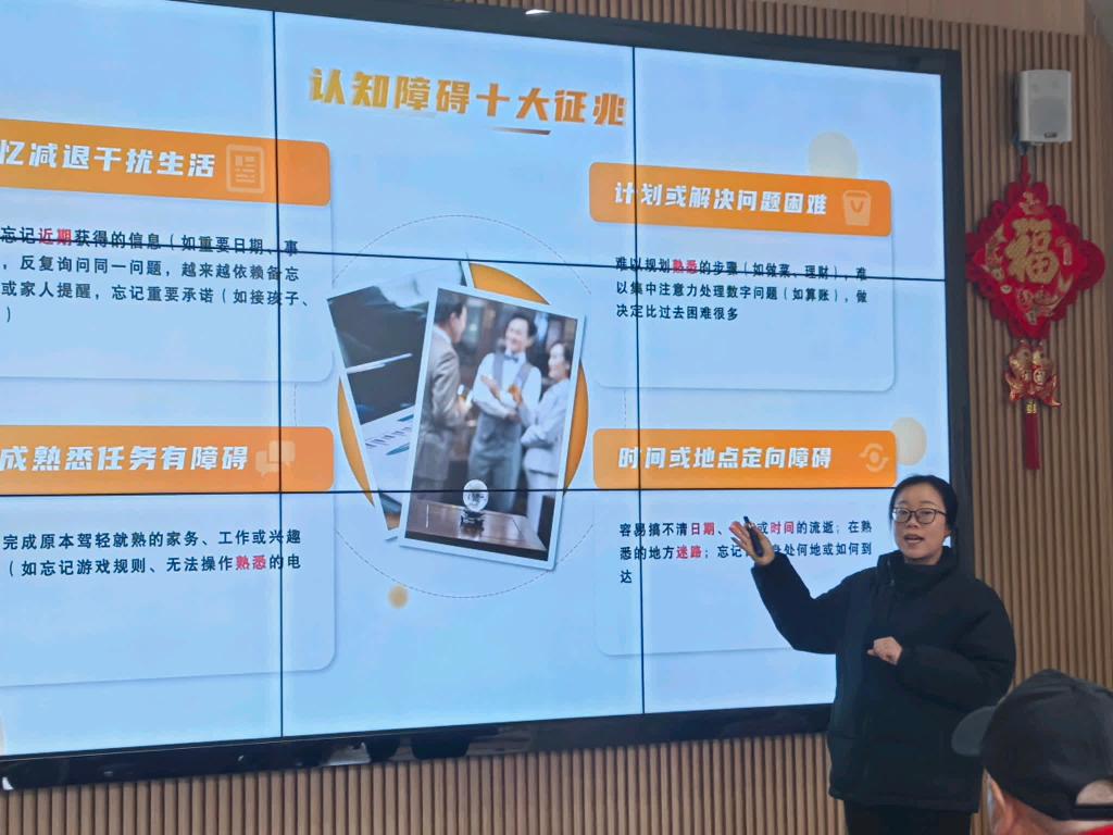 向昨日借光、为明日铺路。代倩以“认识与预防认知障碍”为主题,用通俗易懂的语言、生动形象的比喻为老人和社区志愿者进行科普讲座。“部分认知障碍是可逆的,放弃不是选择,科学行动才是希望。”她结合社会工作服务实例,为老人们早期识别、科学预防认知障碍提供了清晰指导,并从健康饮食、规律运动和睡眠管理等方面解析了日常生活方式的优化策略。代倩还现场教授了手指操,老人们合着节奏拍动手掌、随着指令完成动作,在轻松愉快的氛围中激活大脑功能,提升反应能力。