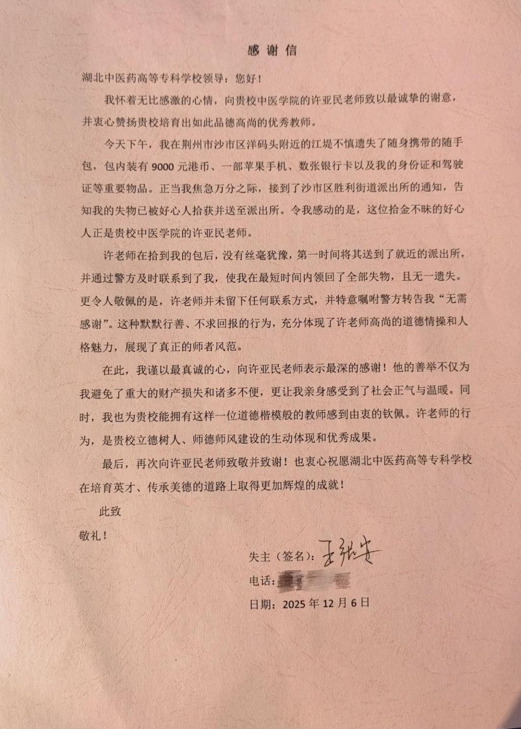 王先生于近日下午在荆州市沙市区洋码头附近的江堤处不慎遗失随身手包,包内装有9000元港币、一部苹果手机、数张银行卡及身份证、驾驶证等重要物品。这些物品不仅涉及大额财产,更关系到日常出行、金融交易等诸多事宜,失主发现遗失后焦急万分。就在其手足无措之际,沙市区胜利街道派出所的通知带来了转机——手包已被好心人拾获并送至派出所,而这位好心人正是我校中医学院的许亚民老师。