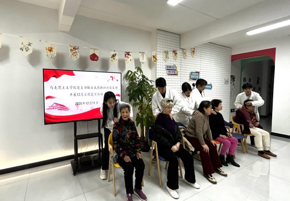 在理论宣讲环节,马克思主义学院副院长熊亮作为武德路社区的一员,紧密结合社区实际和居民关切,将党的二十届四中全会部署与健康中国战略深度融合,用“接地气、冒热气”的话语,紧扣老党员关心的健康保障、养老服务等民生话题,把党的二十届四中全会关于健全公共卫生服务体系、完善社会保障体系的部署,转化为通俗易懂的家常话,让老党员听得懂、能领会、用得上。学校青马班学员、中医2403班马菲雅同学结合党的二十届四中全会关于“加强慢性病综合防控”“推进中医药传承创新”的要求,依托所学专业知识,为大家科普“高血压的中医药防控”常识,普及中医“治未病”理念,建议大家日常调节情志、饮食上少盐少脂、适当运动锻炼、定期规范体检。