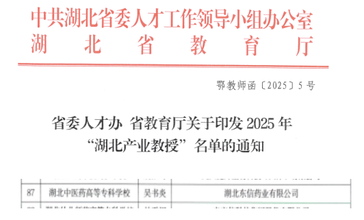 近日,2025年“湖北产业教授”名单公布,经我校推荐的湖北东信药业有限公司副总经理、总工程师吴书炎成功入选。