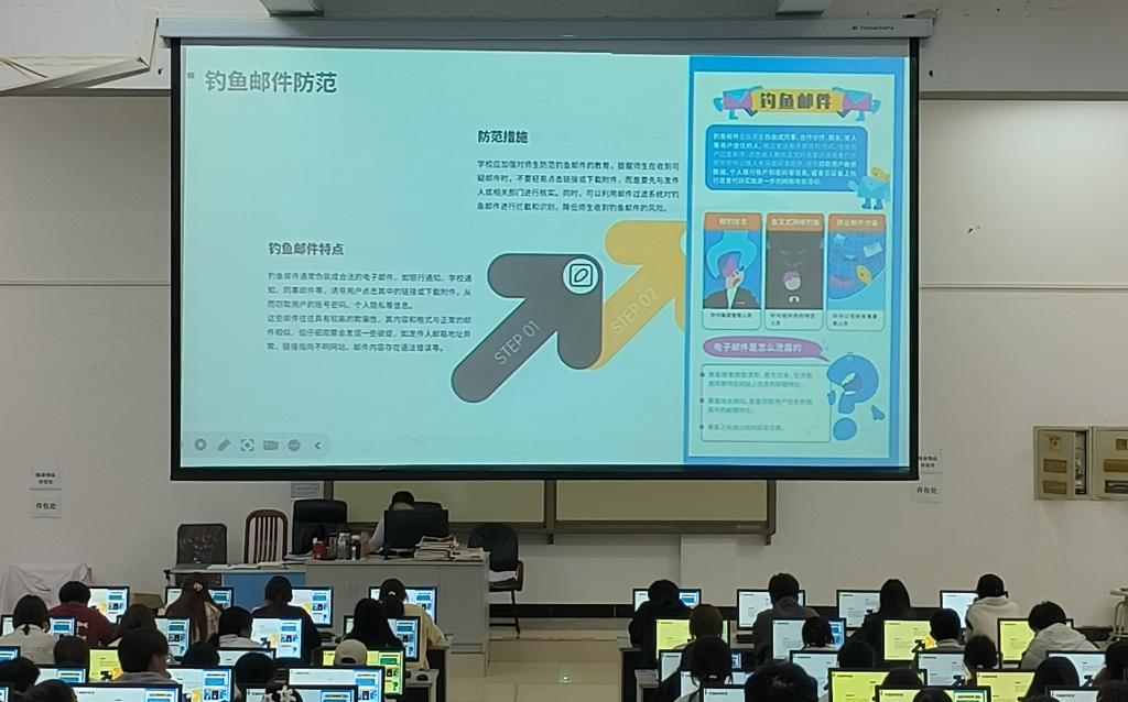 随后利用典型案例,系统阐释了信息泄露、网络诈骗、病毒木马传播、钓鱼邮件攻击、密码安全漏洞、WiFi安全风险等网络安全事件的运作方式,并提出针对性的防护对策。通过AI模拟变声技术演示,剖析了人工智能技术在网络安全领域带来的新型风险挑战。最后胡老师鼓励大家加强学习,主动担当,将安全防范意识融入日常学习生活的点滴之中,筑牢个人和校园网络安全防线。