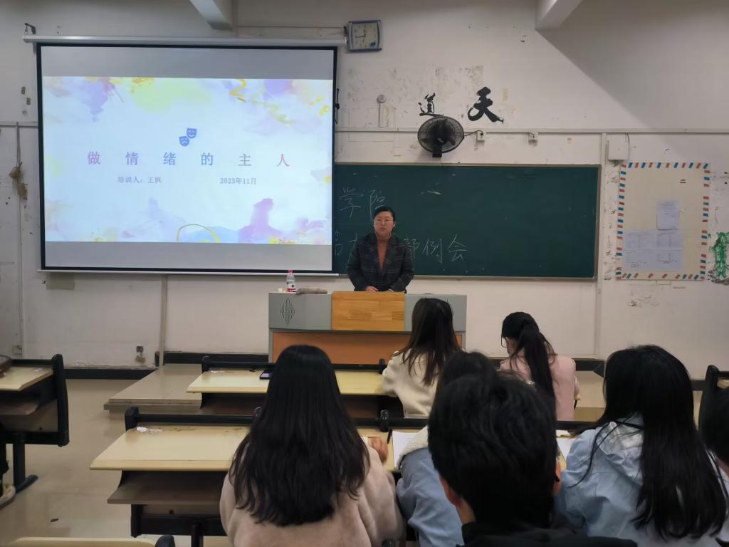 会议开始沈杕老师提出各学生干部需要对部门资料进行梳理,并强调此次会议对学生日常生活以及各部门开展工作的重要性。接着由王枫老师围绕如何做情绪的主人这一主题展开培训内容。向全体学生干部讲述了为什么需要学生干部做关注学生心理健康的工作,如何做此项工作,以及情商在工作开展中的重要性。王枫老师在会上提到,负面情绪不等于消极情绪,要重点观察同学的异常情绪,并展开说明了积极情绪能够带来的好处。讲述了学生做好情绪管理的良好方法:冷静面对、改变思维方式、调整个人心态、转移自身注意力等。最后王枫老师讲解何为情商,以及在为人处事上要注意情商的培养,呼吁同学们在生活中做好自身情绪的管理,真诚待人、择善为行、终身学习。会议最后沈杕老师询问各学生干部近期工作困难以及近期各部门活动进展,希望各学生干部明确自身角色,发挥带头作用,提高工作效率。