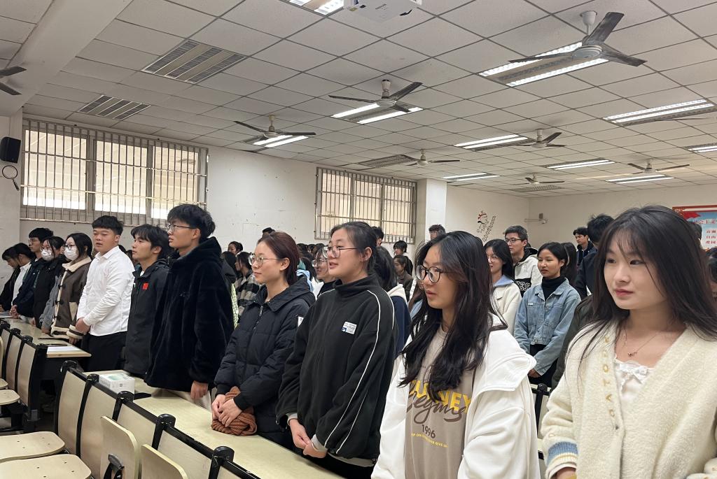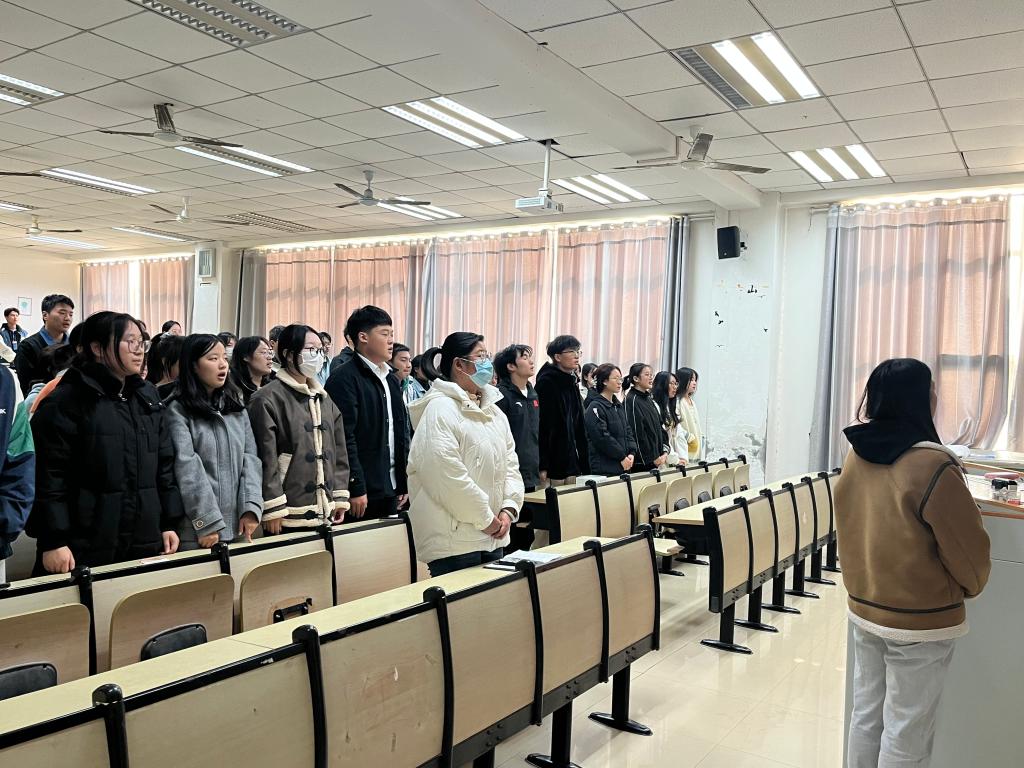 会议开始,全体参会人员起立,奏唱国歌。接着由团总支组织部部长陈曦宣读2023年秋季团员发展名单,王枫、王书琪老师为新团员颁发、佩戴团徽,团总支副书记徐若男带领新团员完成入团宣誓,并奏唱团歌。