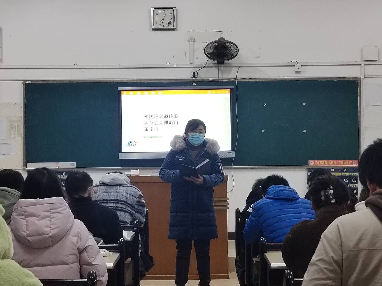 在会上,各班辅导员首先向同学们阅读教育部办公厅关于做好冬季学校流行性疾病防控工作的通知,增强同学们对于呼吸道疾病的防控意识。紧接着,从呼吸道传染病概述、口罩类型及选择、正确佩戴口罩方法、公众佩戴口罩指引、呼吸道传染病预防措施中的正确佩戴口罩相关方面进行提问,并要求同学们回答,确保佩戴口罩的方法深入人心,运用到现实生活中。最后,各班辅导员对预防呼吸道传染病的个人层面进行详细讲解,呼吁同学们要积极锻炼身体、保持好个人习惯,从而保障身体健康。