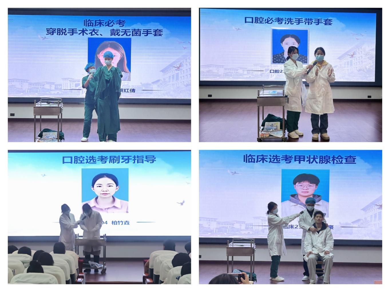 会议表彰了2024年“大医文化节”系列活动中的先进集体、优秀个人。4名在医考模拟大赛中获奖的优秀选手,熟练地展示了巴氏刷牙法、穿无菌衣戴手套、甲状腺检查等操作,全体同学现场观摩,刘琴、胡倩、王宇航老师分别对操作细节进行了点评。通过观摩,同学们能够直观地感受到优秀选手的专业素养和竞技精神,从而反思自身不足,明确努力方向。