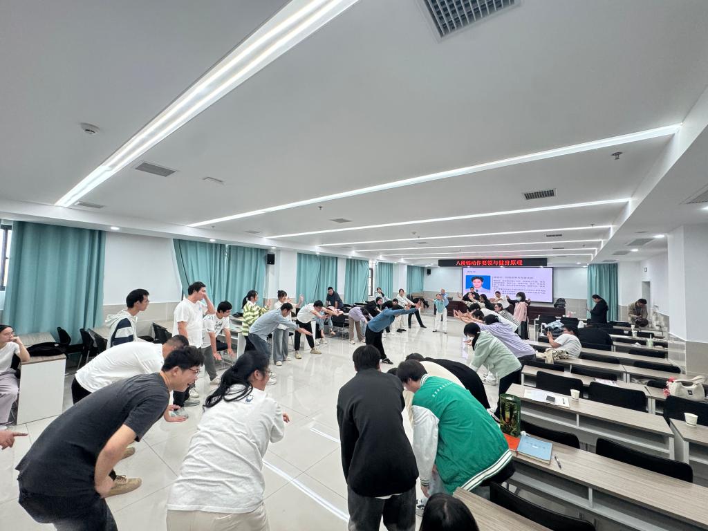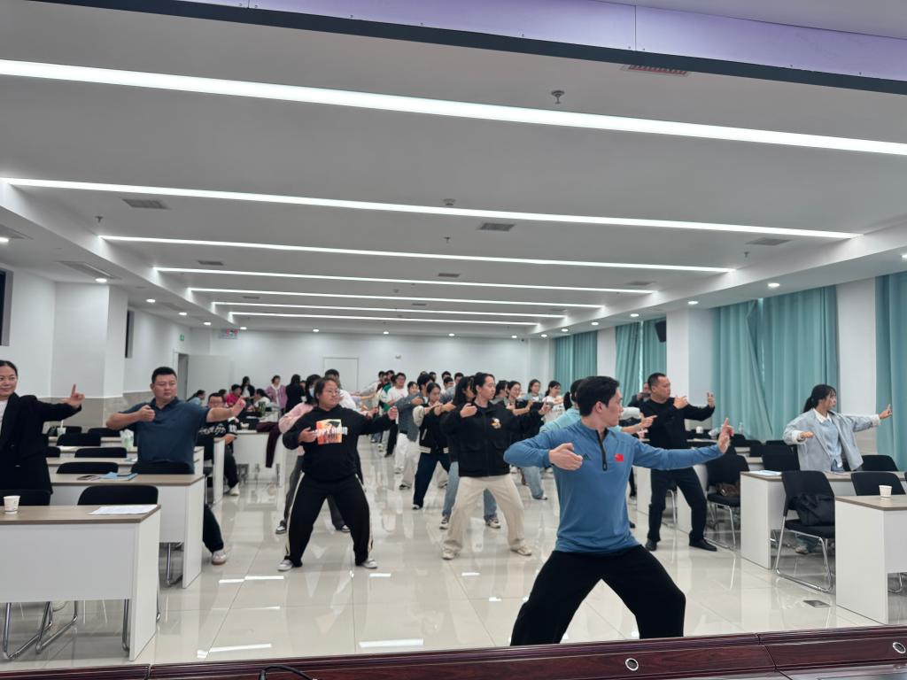 考虑到基层村医日常工作繁忙、压力较大,黄继林博士特意设计了“健康养生实操课”,带领全体参训医护人员练习传统养生功法 “八段锦”。黄继林博士一边示范“两手托天理三焦”“左右开弓似射雕”等动作,一边细致讲解每个招式的发力要领与对颈肩、腰背的调理作用,针对村医常见的久坐导致的肩颈酸痛问题,重点指导了放松拉伸技巧。“动作简单好记,工作间隙练几分钟,感觉肩背都舒服了!”大家跟着节奏认真练习,现场氛围轻松愉悦,既缓解了培训疲劳,也掌握了便捷的日常锻炼方法。