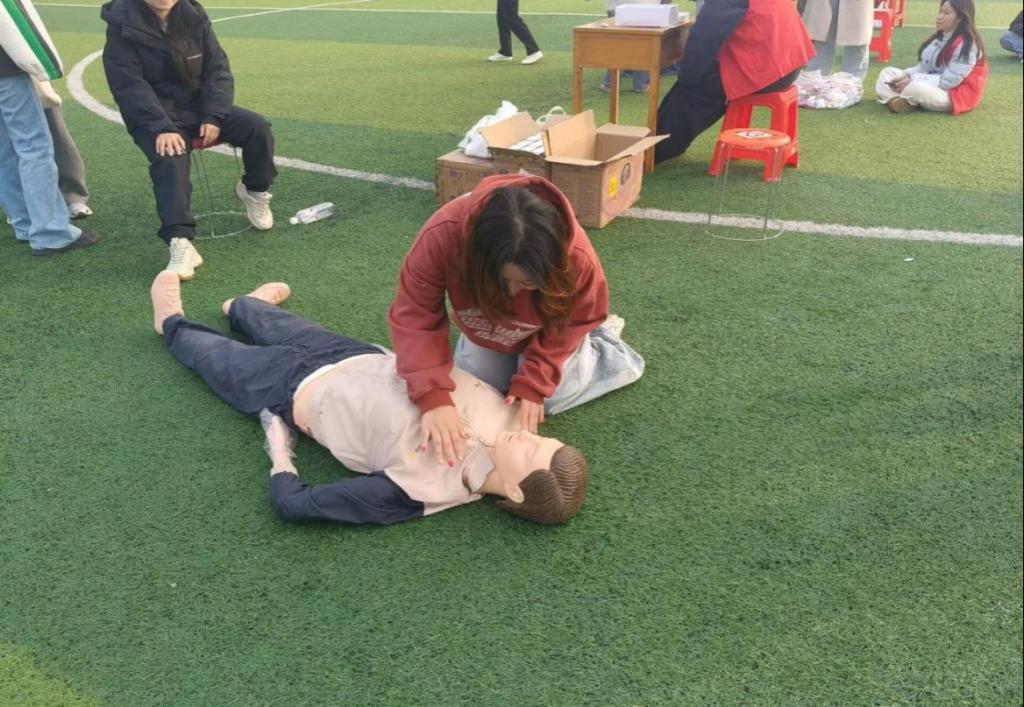 在“知风险”篇章的“火眼金睛”答题环节,参赛选手从容应对防火、防盗、防电信诈骗等各类安全问题,现场答题准确率达90%以上,展现出扎实的安全知识储备。“会急救”作为竞赛核心环节,采取“理论回答+现场实操”考核模式,王敏老师现场进行细致点评。老师针对按压深度、呼吸频率等细节精准指导,让在场志愿者与参赛选手均收获实用急救知识。