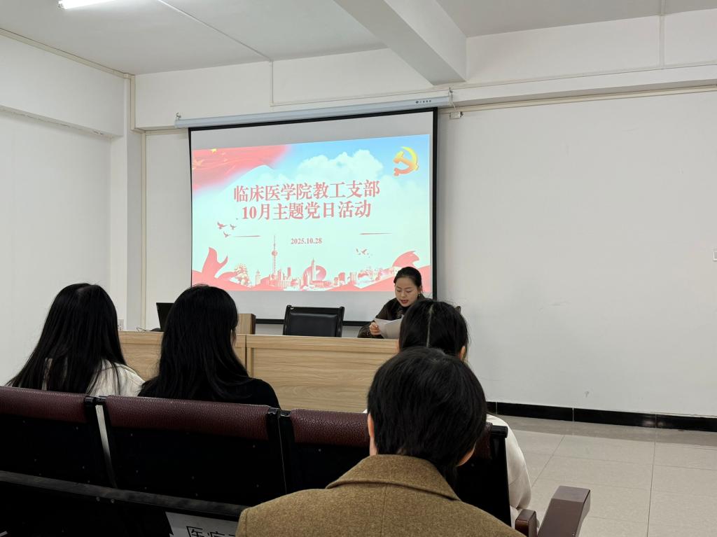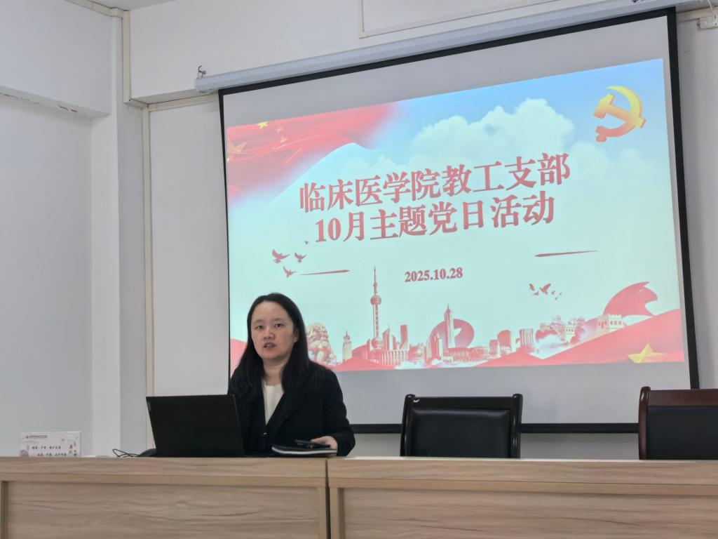 10月28日,临床医学院教工党支部在212会议室开展10月份主题党日活动。活动主题“筑牢思想根基 砥砺实干担当”,会议由学院教工党支部书记李丽主持。