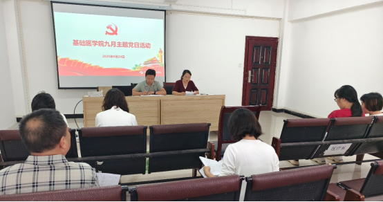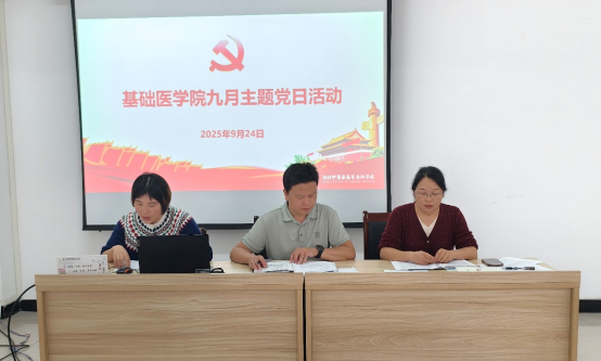 本网讯(通讯员:吴娜)9月24日下午,基础医学院以“建设先行区、当好排头兵”为主题召开九月主题党日活动,通过理论领学、纪律警示、实践教育相结合的方式,统一思想共识、凝聚奋进力量,为学院高质量发展及学校升本工作夯实政治基础。活动由支部书记陈建勇主持,全体党员参会。