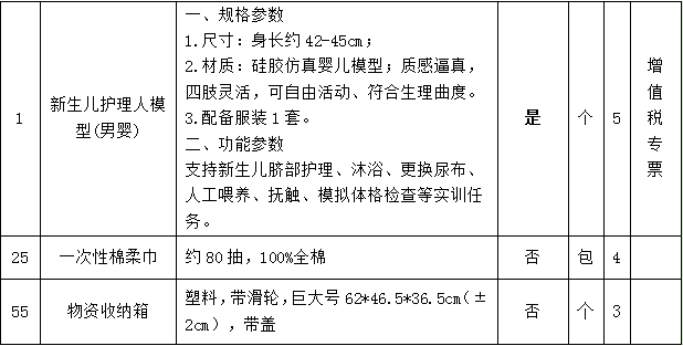 (1)原采购文件中货物清单中“1.新生儿护理人模型(男婴)”、“25.一次性棉柔巾”、“55.物资收纳箱”参数更正为: