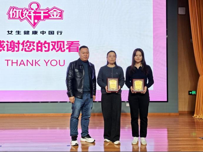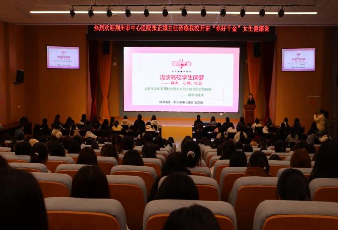 本网讯(学生记者:李诗怡 江娜娜)为普及女性健康知识,增强女性安全意识,提升自我保护能力,2025年10月27日晚19:00,由千金药业股份有限公司主办的“你好,千金——女生健康中国行”公益讲座在湖北中医药高等专科学校顺利举行。荆州市中心医院妇产科主任医师张正娥受邀担任主讲嘉宾,药学院党总支副书记罗艾明,专职辅导员欧阳晶晶、张童、李晓东、李佳,药学院学生分会全体成员以及药学院2025级全体女生共同参与。