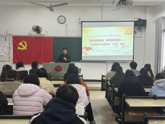 本网讯(通讯员:李佳)为深入学习贯彻落实党的二十届四中全会精神,进一步强化纪律意识、筑牢思想防线,以严明纪律护航药学院“十五五”建设开好局、起好步,2025年12月4日,药学院在513教室开展“学习贯彻党的二十届四中全会精神”党课学习,药学院党总支书记孙洁主讲,支部全体党员、预备党员及入党积极分子参加。