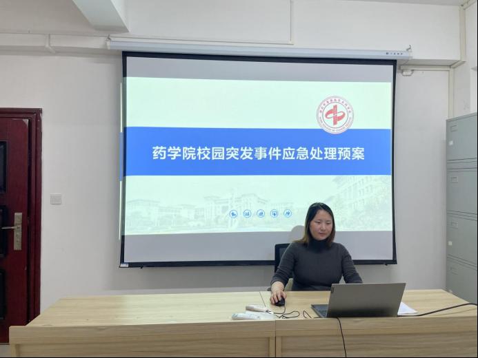 本网讯(学生记者:张雅娟 杜雯雯)为深入贯彻落实教育厅及学校关于假期安全稳定工作的部署要求,进一步增强全院师生安全防范意识,提升应急处置能力,确保节假日期间校园安全稳定,药学院于2025年12月23日17时在系部楼209会议室组织开展“节假日校园突发事件应急处理预案”专题宣讲培训会。本次培训由药学院团总支书记骆文主讲,学院党总支书记孙洁、副书记罗艾明、学生科科长董琴学及全体专职辅导员共同参与,推动应急预案人人知晓、层层落实。