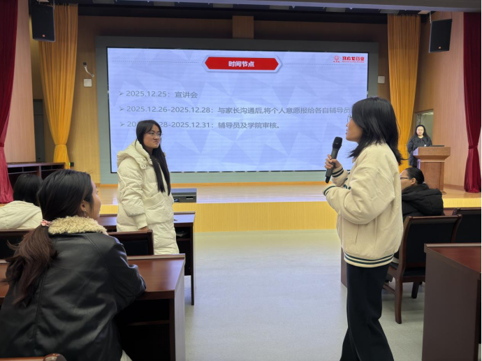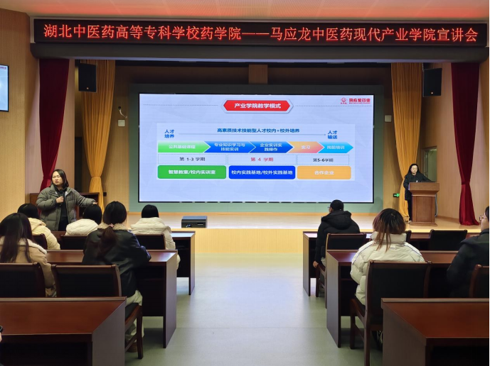 本网讯(学生记者:张雅娟 李诗怡)为深入贯彻落实国家“十四五”中医药发展规划,深化产教融合与校企协同育人,推动中医药现代化产业人才培养提质增效,药学院于2025年12月25日晚19:00在综合楼学术报告厅举办马应龙中医药现代产业学院宣讲会。会议由药学院专职教师胡梦圆主讲,党总支书记孙洁、副书记罗艾明、学生科科长董琴学、专职教师鲍闻渊、魏龙吟及全体专职辅导员出席,2024级药学、中药学、药品质量与安全三个专业全体学生参加。