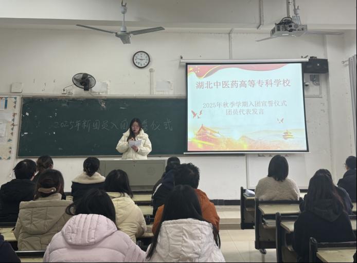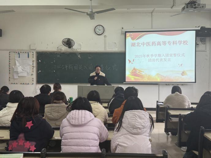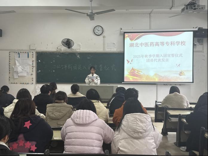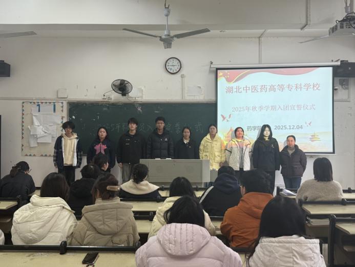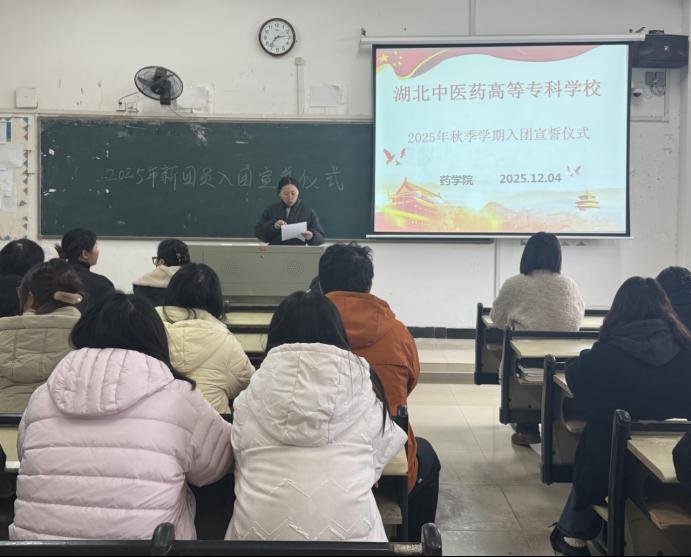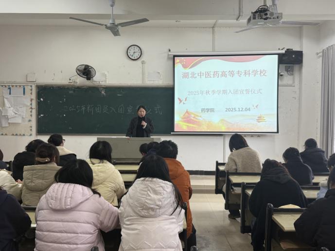 本网讯(学生记者:蒲思源 闵诗程)为加强共青团组织建设,增强青年团员的光荣感和使命感,2025年12月4日14时30分,药学院在医专教学楼503教室隆重举行2025年秋季新团员入团宣誓仪式。仪式由药学院团总支书记骆文主持,党总支副书记罗艾明、学生党支部书记董琴学、专职辅导员张童、李佳、宋黎、李晓东、欧阳晶晶等老师出席仪式,与新团员及学院组织部成员共同见证这一庄严时刻。