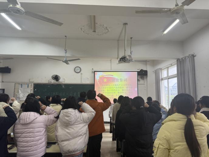 在团总支副书记王梦洋的带领下,全体新团员面向鲜红的团旗,高举右拳庄严宣誓:“我志愿加入中国共产主义青年团……”铿锵有力的誓言在教室回响,展现了新时代青年坚定跟党走、奋进新征程的决心与信念。