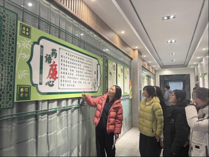 师生一行还参观了康盟产业园廉洁文化展示区。在罗艾明的讲解下,大家观看“药语廉心”主题展板,从“茯苓祛浊”“莲子清心”等中医药智慧中体悟“廉以养德、淡以明志”的廉洁内涵,在感受传统文化魅力的同时,接受沉浸式廉政教育,为清廉学院建设注入人文底蕴。