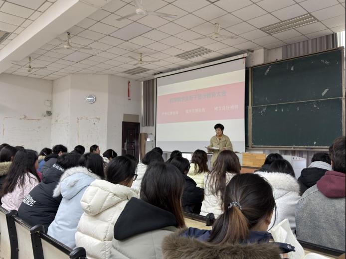 本网讯(学生记者:陈丽梅 张雅娟)为进一步加强学生骨干队伍的作风建设、纪律意识和责任担当,筑牢服务同学的思想根基,充分发挥其在学生群体中的先锋模范作用,药学院于2026年1月8日14:30在教学楼201组织召开骨干警示教育和交流大会暨考风考纪教育大会。本次大会以“严守纪律红线、筑牢思想防线、树立良好榜样”为主题,围绕三个核心议程展开。会议由学生党支部书记董琴学主持,学院党总支书记孙洁、副书记罗艾明、团总支书记骆文、专职辅导员欧阳晶晶、李佳及全体学生骨干出席会议。