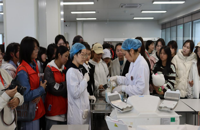 在血站工作人员的引导下,师生们参观了科普馆,系统了解血液的奥秘与无偿献血的意义。大家依次走进检验科、成分制备科和成品库等核心科室。检验科内,精密仪器对每份血液进行严格筛查,筑牢临床用血安全防线;成分制备科中,大型离心机对全血进行精细分离。通过实地探访,同学们直观感受到一袋血液从采集、检测到制备、储存的全过程,深刻体会到生命之间无私联结的伟大。