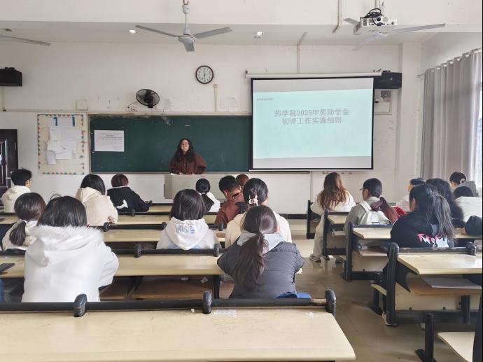 本网讯(学生记者:朱浩龙)为深入落实国家奖助学金政策,确保评选工作规范有序开展,药学院于2025年11月11日11:20在503教室召开奖助学金座谈会。会议由药学院学生科科长董琴学主持,药学院辅导员李佳以及大一、大二各班级代表参加。