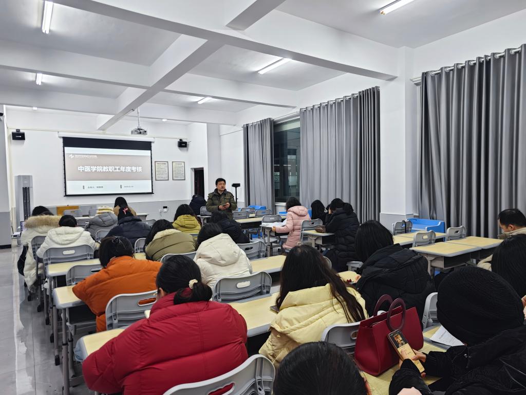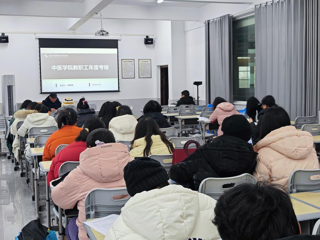 2026年1月30日14:30,中医学院在综合楼409会议室召开全体教职工大会,学院全体教职工参加会,会议由党总支书记杨敬博主持。 会议首先聚焦2025年度教职工考核工作。杨敬博书记带领全体教职工共同学习学校年度考核文件,随后宣读《中医学院2025年度教职工考核方案》,从考核对象、原则、内容标准到程序步骤进行详细说明,确保考核工作透明规范。在述职评议环节,学院副科级干部及全体教职工依次上台,围绕年度岗位职责履行、工作业绩成效、存在不足与改进方向等方面作全面汇报。述职结束后,会议组织民主评议投票,由教工支部支委叶春雨负责唱票,学工支部支委沈歆璐负责监票,全程公开透明,保障考核结果公平公正。
