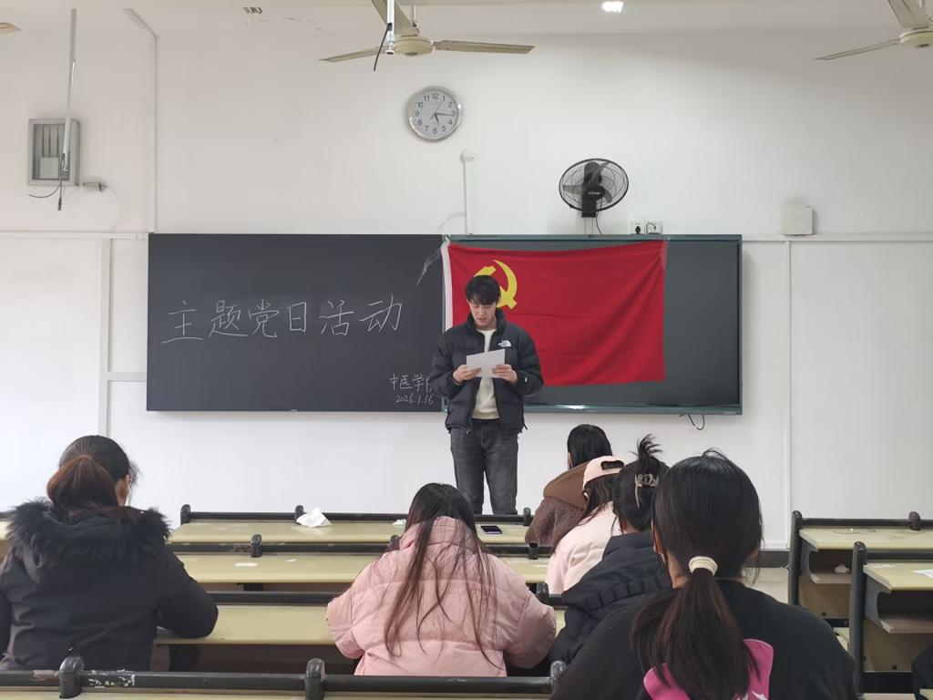 本网讯 2026年1月16日,中医学院学生党支部在教学楼511组织开展了主题为“跃马扬鞭自奋蹄 复兴崛起开新局”的主题党日活动,学生党支部全体党员参加。 本次会议由支部书记胡晨主持。首先学习贯彻习近平总书记重要讲话和重要指示批示精神:张晨阳同志领学了习近平总书记二〇二六年新年贺词;肖裕华同志领学了习近平总书记在中共中央政治局民主生活会上的重要讲话精神;孙德同志领学了习近平总书记在全国政协新年茶话会上的重要讲话精神;沈歆璐同志领学了《中国共产党纪律处分条例》第五十一条。 随后,党支部书记胡晨同志组织全体党支部同志学习贯彻党的二十届四中全会精神、省委十二届十一次全会精神、市委六届十二次全会精神,并组织党员结合工作,逐一开展交流研讨。 最后,全体党员重温入党誓词,集体诵读《中国共产党章程》,并交纳1月党费。(肖裕华/文、摄)