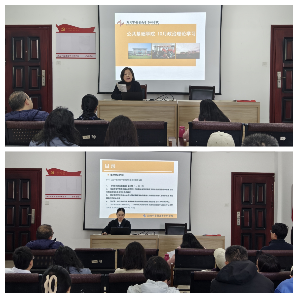 本网讯(通讯员 张惜柳)10月23日,公共基础学院组织全体教师在办公楼203会议室开展政治理论学习,公共基础学院院长张燕主持会议,党员教师张惜柳领学。 本次政治理论学习聚焦习近平新时代中国特色社会主义思想和法治教育两大专题。《习近平谈治国理政》第五卷(一、二、三);习近平在中共中央政治局第二十二次集体学习时强调,系统推进我国宗教中国化,积极引导宗教与社会主义社会相适应;习近平给天津大学全体师生回信强调,聚焦国家重大战略需求提高人才培养质量,更好服务经济社会发展;习近平:在庆祝中华人民共和国成立76周年招待会上的讲话;《中华人民共和国法治宣传教育法》。 我国是中国共产党领导的社会主义国家,积极引导宗教与社会主义社会相适应是必然要求。要坚持以社会主义核心价值观为引领,引导宗教界人士和信教群众牢固树立正确的国家观、历史观、民族观、文化观、宗教观,不断增进“五个认同”,自觉投身中国式现代化建设。 习近平在给天津大学全体师生回信时强调,坚持以新时代中国特色社会主义思想为指导,聚焦国家重大战略需求,深化教学科研改革,加强基础研究和科技攻关,提高人才培养质量,更好服务经济社会发展,为建设教育强国科技强国、推进中国式现代化作出新的贡献。 我们要紧紧围绕新时代新征程党的中心任务,把“十五五”发展的目标任务和战略举措规划好实施好,确保基本实现社会主义现代化取得决定性进展。 国家工作人员应当带头尊法学法守法用法,树立依法履职的法治观念,提高运用法治思维和法治方式深化改革、推动发展、化解矛盾、维护稳定、应对风险的能力。 我们要深入学习习近平新时代中国特色社会主义思想最新成果,坚守“为党育人、为国育才”初心使命,大力弘扬教育家精神,自觉将理论成果融入教育教学全过程。践行自我革命精神,严于律己、奋勇争先、担当作为,积极投身教育强国建设,为推进学校高质量发展、建功支点贡献党员力量。