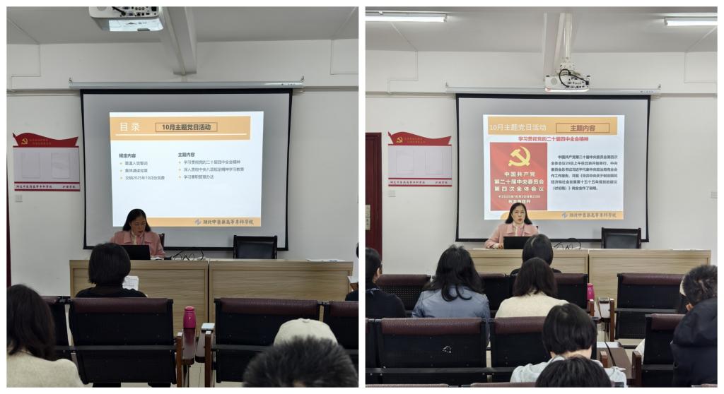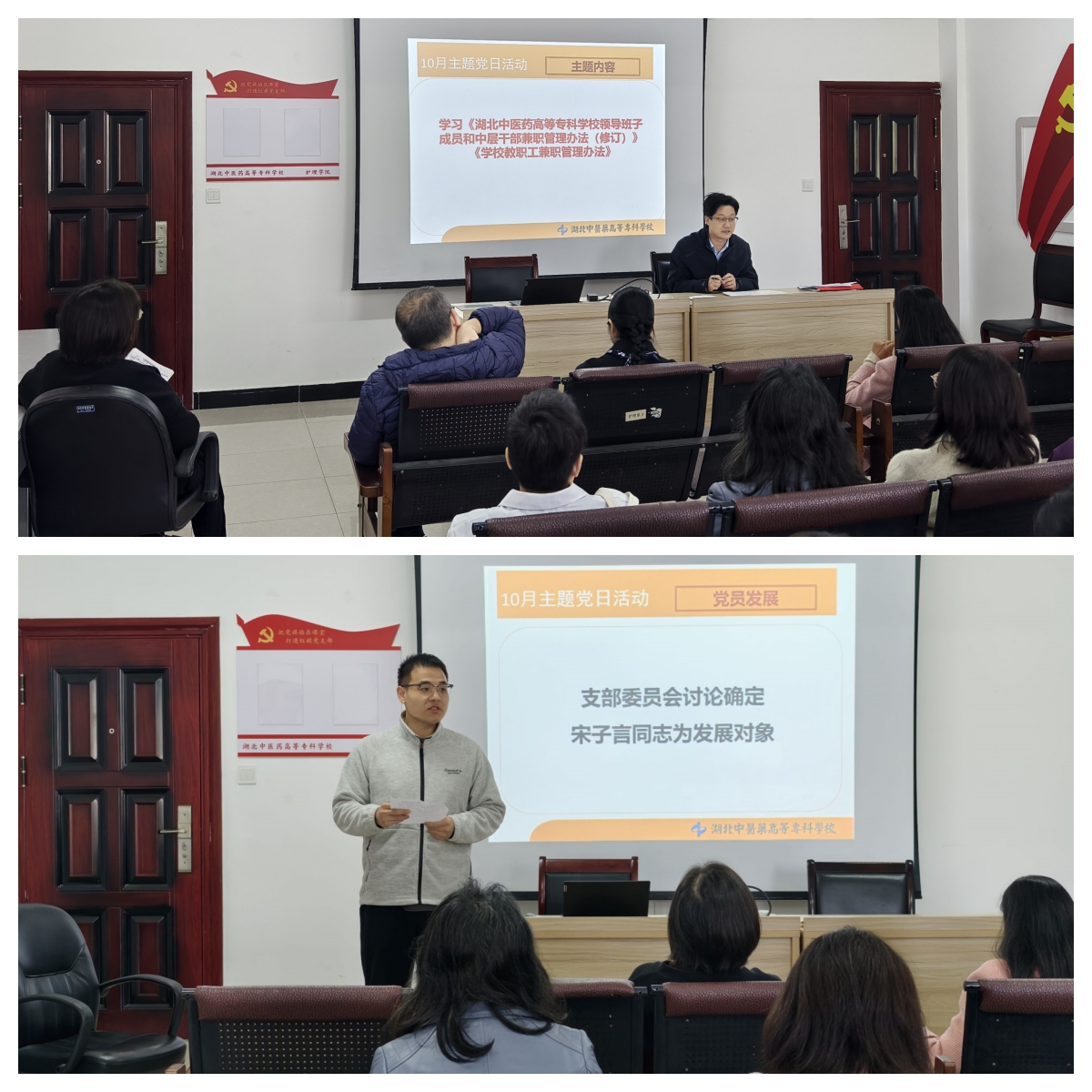 一、主题内容 1.学习贯彻党的二十届四中全会精神:中国共产党第二十届中央委员会第四次全体会议于2025年10月20日至23日在北京召开,广大党员教师将持续关注、认真学习;深入学习习近平总书记关于力戒形式主义官僚主义、树立和践行正确政绩观、推动高质量发展的重要论述,推动“建设示范区、当好排头兵”取得新成效。 2.深入贯彻中央八项规定精神学习教育 持续开展学习:学习石泰峰在深入贯彻中央八项规定精神学习教育中央指导组暨中央层面工作专班总结会上的讲话;《中央纪委国家监委公开通报八起违反中央八项规定精神典型问题》;《湖北省通报5起党员干部、公职人员酒驾醉驾典型问题》;《湖北省通报5起领导干部违规干预和插手招标投标活动典型问题》;《关于6起违反中央八项规定精神典型问题的通报》。 3.组织学习兼职管理办法:学习《湖北中医药高等专科学校领导班子成员和中层干部兼职管理办法(修订)》《学校教职工兼职管理办法》。 4.支部委员会讨论确定宋子言为发展对象。