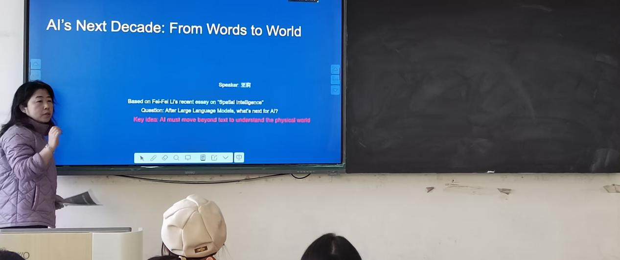 本网讯(通讯员 王莉)11月27日,公共基础学院王莉副教授在教学楼205教室围绕人工智能前沿话题作专题学术讲座。讲座主题为“AI的下一个十年:从文字到世界”,聚焦AI未来发展方向--空间智能(Spatial Intelligence),吸引了众多师生到场聆听,现场秩序井然、气氛热烈。 讲座中,王莉老师从“语言世界”与“物理世界”的差异为开端,讲述当前AI现状------擅长处理文本,可在写作、翻译、问答等任务中表现出色,但对现实世界中的物体形状、大小、重量及其受力、运动方式等缺乏直观理解,只能“懂词不懂物”。这是现阶段AI的局限所在。 随后,王莉老师系统阐释了“空间智能”的内涵及其与人类日常经验的紧密联系。她以停车、接住抛来的钥匙、绕开障碍物等生活场景为例,说明人类是如何通过视觉、触觉等感官在交互中形成对空间与物理规律的直觉认知,并引出“世界模型”(World Models)的概念:通过构建内部世界模型,让AI不仅能“看见”世界,更能理解并在虚拟环境中创造三维空间、建筑和物体,从而实现创意设计、多模态感知以及与环境的动态交互。 在应用层面,王莉老师结合PPT,生动展示了空间智能在影视与游戏创作、建筑设计、机器人导航、医学影像辅助诊断以及教育虚拟仿真等领域的广阔前景。例如,借助空间智能,设计者可以在建筑尚未落成前“走进”虚拟空间体验方案;机器人则能够自主识别环境、避开障碍执行清洁和搬运任务;学生也可以在沉浸式场景中学习细胞结构或历史事件,使抽象知识更具象、更易理解。 此次学术讲座紧扣人工智能尤其是空间智能的前沿进展,把抽象的概念与日常生活、课堂学习紧密结合,让师生对“AI到底能做什么、还缺什么”有了更清晰的认识。讲座内容前沿、案例丰富,不仅加深了师生对人工智能发展趋势的认识,也激发了在场师生极大投身新科技学习与研究的热情。
