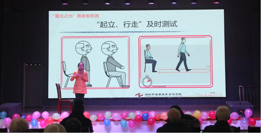 活动的第二部分,是“星火之光”敬老服务团的高洋洋老师为老年人做防跌倒知识宣讲,高老师从如何活动四肢关节,如何安全行走,饮食要高蛋白等方面进行讲解和演示。
