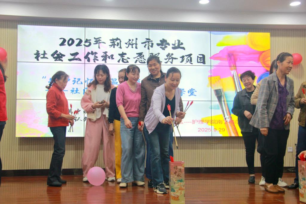 9月29日上午,护理学院南丁格尔志愿服务队携手梅村社区,在社区党群服务中心二楼举办了“守护记忆 温暖银发”社区认知症预防趣味学堂项目中秋特别活动。本次活动延续“家庭—社区—高校”三方联动模式,特邀长江大学医学部周红教授助阵,将传统节庆与认知障碍防治相结合,开展了一系列专业性与趣味性兼具的活动。
