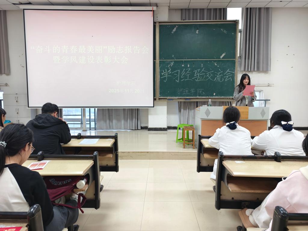 本网讯(付佳仪 刘彩霞 高婷 白佳琦)青春因拼搏而精彩,学业因笃行而精进。为深入推进学风建设,树立先进典型,11月20日,护理学院在教学楼201教室举行“奋斗的青春最美丽”励志报告会暨学风建设表彰大会。护理学院学生科科长杨青、团总支书记杨晓棋、专职辅导员祝清及24级、25级优秀学生代表参加会议。