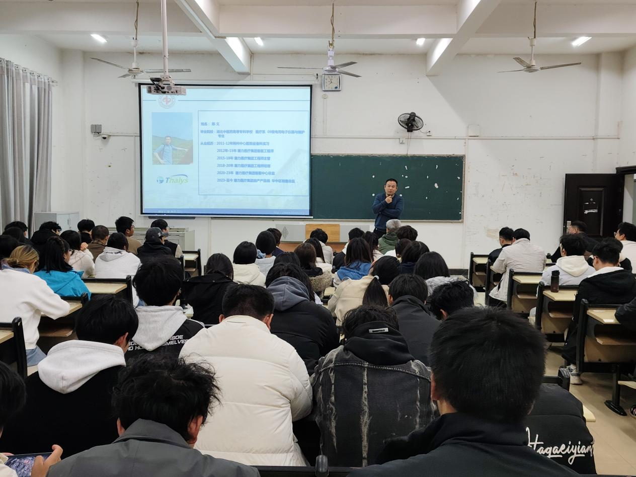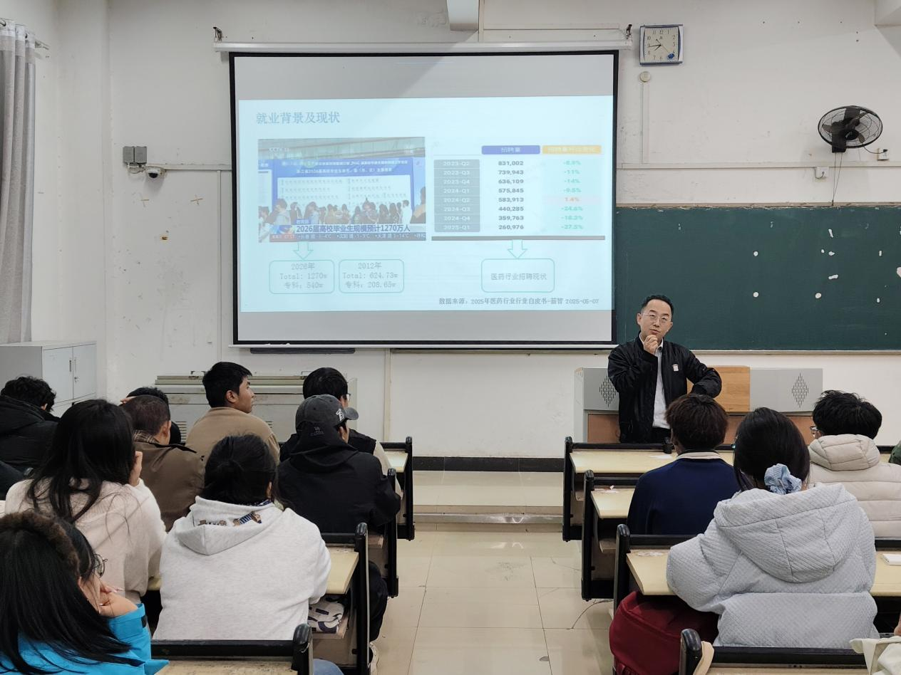 新闻网讯(通讯员 水忻怡 杜雯雯)为帮助学生明晰职业发展方向,科学规划学业与职业生涯,药学院于2025年11月27日19点在医专教学楼510教室举办“职海引航,春晖映庠”优秀校友经验分享会。活动邀请09级医用电子仪器与维护专业优秀毕业生招商局集团人福医药医用耗材部总监艾昊、美敦力医疗集团湖北销售经理王豪、赛力医疗集团华中区销售总监陈义、崇阳县第二人民医院设备科科长石文鹏四位优秀校友担任主讲,药学院党总支副书记罗艾明主持,2024级、2025级智能医疗装备技术专业全体学生参加。