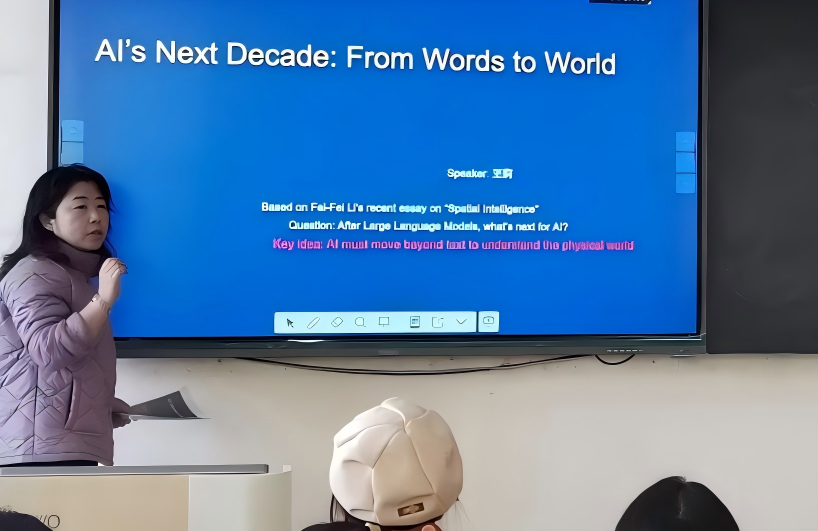 11月27日,王莉副教授作题为“AI的下一个十年——从文字到世界”的专题讲座,聚焦人工智能前沿领域——空间智能,深刻剖析了当前AI“懂词不懂物”的局限,系统阐释了“世界模型”如何使AI理解并交互于三维物理环境。王老师生动结合建筑预览、机器人导航、医学影像辅助及教育虚拟仿真等现实案例,清晰展现了空间智能的广泛应用前景,让抽象的科技概念变得具体可感,既加深了师生对AI发展趋势的理解,也点燃了师生探索新科技的热情。