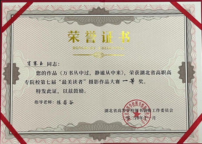 我校通过院系推广,读书协会宣传、公告栏公式等多渠道动员。我校学子肖塞玉的作品《万书丛中过,静谧从中来》,在指导老师陈若谷的指导下,荣获大赛一等奖。其作品以独特的视角展现了阅读时的静谧氛围,深刻诠释了“最美读者”的内涵,最终夺得桂冠。 该奖项不仅是对肖塞玉摄影技艺与阅读情怀的双重肯定,也体现了学校在校园阅读推广与文化育人工作中的扎实成效,为校园文化建设添上了浓墨重彩的一笔。