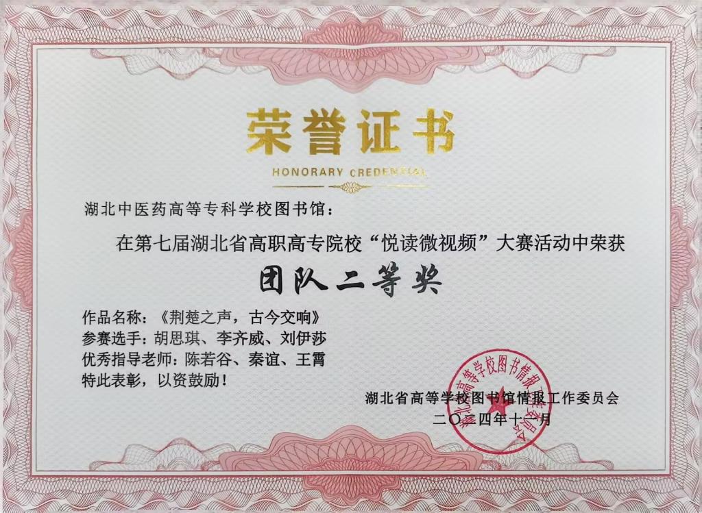 本次大赛由湖北省由湖北省高等学校图书情报工作委员会高职高专分委会主办。我校团队作品以荆楚文化为切入点,通过微视频形式展现文化传承与创新,充分体现了高职学子对阅读与文化传播的热忱,为校园文化建设添增了亮丽一笔。