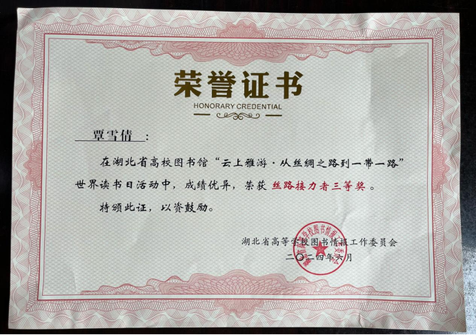 本网讯(学生记者:熊天娇)为了让更多的读者感受到中华文化的魅力,讲好中国故事,传播好中国好声音。近日,湖北省高等学校图书情报工作委员会主办“云上雅游·从丝绸之路到一带一路”世界读书日活动,我校参赛学子覃雪倩凭借对“丝绸之路”文化与“一带一路”内涵的深度解读,在活动中荣获丝路接力者奖项的三等奖。