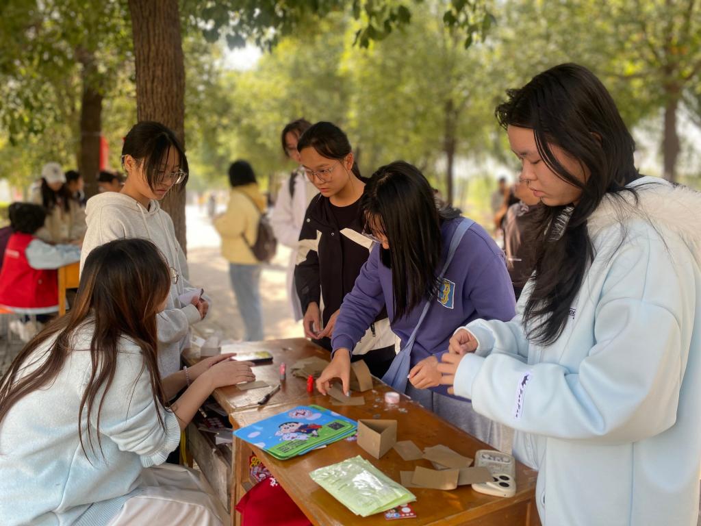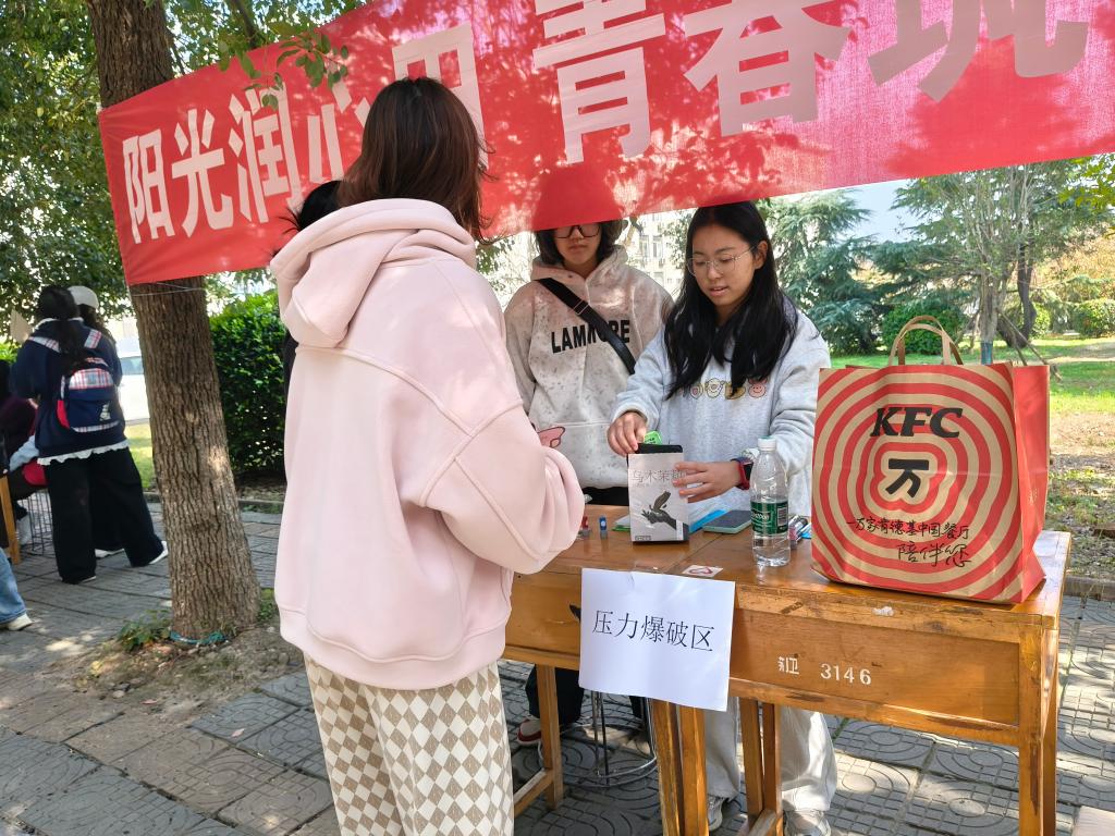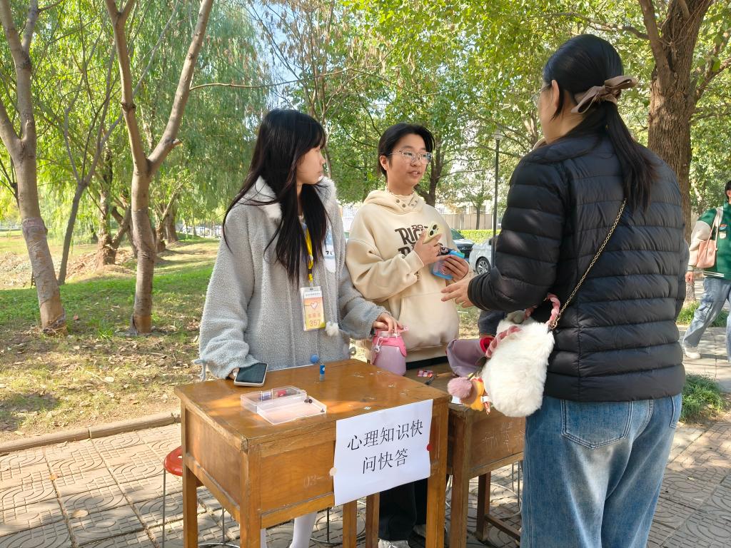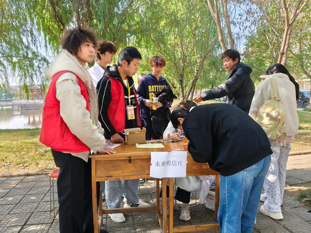 活动现场,人头攒动,气氛欢悦而热烈。活动以“游园集章闯关”为特色形式,六大关卡围绕情绪管理、压力释放、团队协作等维度精心设计,让学生在趣味互动中解锁心理成长密码。情绪猜猜乐环节,学生两人一组,通过夸张的面部表情和肢体动作演绎“狂喜”“焦虑”等情绪词,在欢笑中提升了情绪感知力;压力爆破区里,大家将学业、生活中的压力源写在气球上,随着“砰”的一声爆破,压力也仿佛随之消散;合作塔搭建关卡,四人小组围成一圈,全神贯注地利用扑克牌和胶带在有限时间内搭建高塔,智慧的碰撞与默契的配合将现场气氛推向高潮;赞美轰炸现场,同学们真诚地向志愿者或同伴连续送出五句赞美之词,温暖的话语如同冬日阳光,照亮了彼此的脸庞,也润泽了心田;心理知识快问快答环节,巧妙地将心理健康知识融入趣味挑战中,同学们抽取题目、快速作答,在收获成就感的同时也增长了心理学常识;未来明信片处,学生们认真写下对期末或未来自己的期许,投入“时光邮箱”,期待着这份来自当下的鼓励在期末绽放。