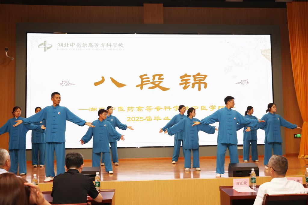 本网讯 2025年6月8日晚,湖北中医药高等专科学校中医学院2025届毕业典礼在学校综合楼学术报告厅隆重举行。典礼以“传承中医药使命,弘扬杏林精神”为主题,校领导、师生代表及特邀嘉宾齐聚一堂,共同见证这一庄重而温馨的时刻。 18时起,毕业生们有序入场签到,暖场环节设计别具匠心。现场播放的校庆宣传视频,勾起了毕业生对在校生活的美好回忆;中医特色表演——八段锦集体展示,则充分展现了中医药文化的独特魅力。
