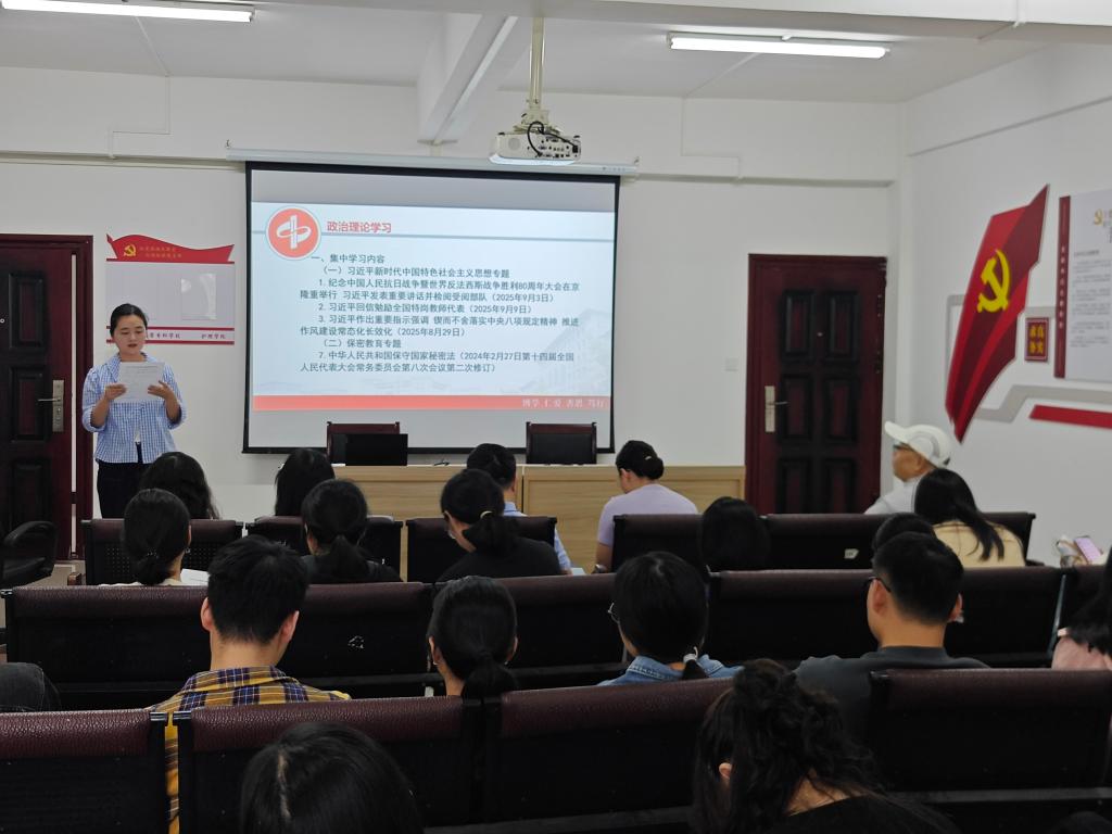 本网讯 9月18日下午,中医学院在202会议室开展9月份政治理论学习,会议由学院党总支书记杨敬博主持,中医学院全体教职工参加会议。 中医养生教研室的老师们分别领学了《纪念中国人民抗日战争暨世界反法西斯战争胜利80周年大会在京隆重举行 习近平发表重要讲话并检阅受阅部队》《习近平回信勉励全国特岗教师代表》《习近平作出重要指示强调 锲而不舍落实中央八项规定精神 推进作风建设常态化长效化》等内容,宣讲学习《中华人民共和国保守国家秘密法(2024年2月27日第十四届全国人民代表大会常务委员会第八次会议第二次修订)》的内容。 会上,杨敬博指出全体教职工要深刻领会文件精神,将学习成果转化为实际工作中的动力和指引。他要求大家在日常教学和科研工作中,积极践行中央八项规定精神,保持清正廉洁的工作作风,同时要严格遵守国家保密法律法规,增强保密意识,杜绝失泄密事件的发生。学习过程中,教职工们认真聆听、仔细记录,纷纷表示将把学习内容内化于心、外化于行,以更加饱满的热情和严谨的态度投入到教育教学工作中。